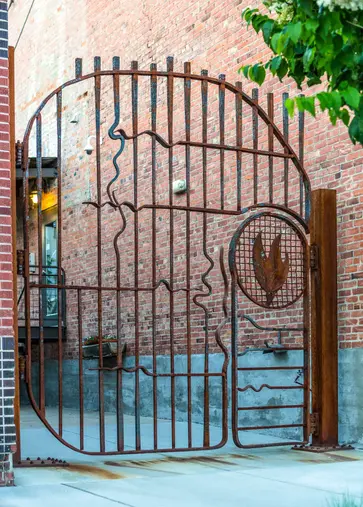 Creating beautiful and functional art for an urban revitalization project in a downtown historic district, Montana Ironworks built a custom metal gate 14 feet high and 14 feet wide for side entries between two buildings. Using whimsical discontinued curving pickets, and a forged and carved floral detail, both the smaller man gate and the larger overall gate open completely.